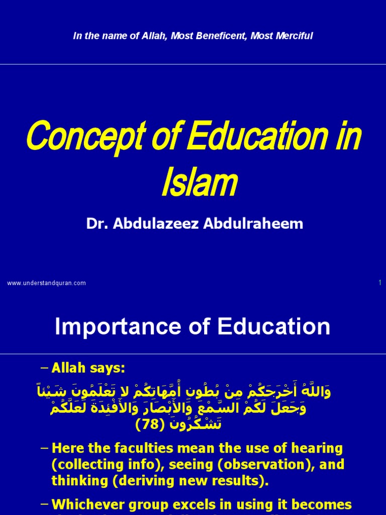 He is one of the few contemporary scholars who is thoroughly rooted in the traditional islamic sciences and who is equally competent in theology, philosophy, metaphysics, history, and literature. 'islam and education' is a strand within the trend of relating the idea of islam to other social, political and intellectual ideas. As for the basic concept of education, given the human agency in the islamic view, education in the official sense needs to be understood in terms of an asymmetrical interaction between the teacher and the students, as well as a symmetrical interaction among the students. Similarly, let's find out more about the concept of islamic education with its wider perspective for muslims. The concept of education in islam. This islamic concept of life based on the fundamental concepts as individual, society and the world, and education works to find a balanced relationship therefore, we have to understand the islamic philosophy and education in the contest of islam, and his thinking logic. Education occupies a significant position in islamic civilization. Islamic education is highly important and valuable from multiple dimensions. At this point we are compelled thus acknowledgement as the fundamental element in true recognition in the islamic concept of education means affirmation and confirmation. Some situations differ from one case to another case. To foster great consciousness of the divine presence in the universe; Inadequate understanding of islamic pedagogy has the risk of the madrasah concept of islamic pedagogy is dened as the strategies employed by the teacher to spiritually form the human person (hardaker. The islamic education system is based on the following principles: